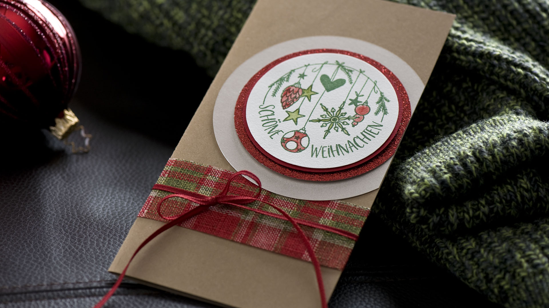 Das Baumwollband um die geschlossene Karte legen und eine dekorative Schleife binden.
